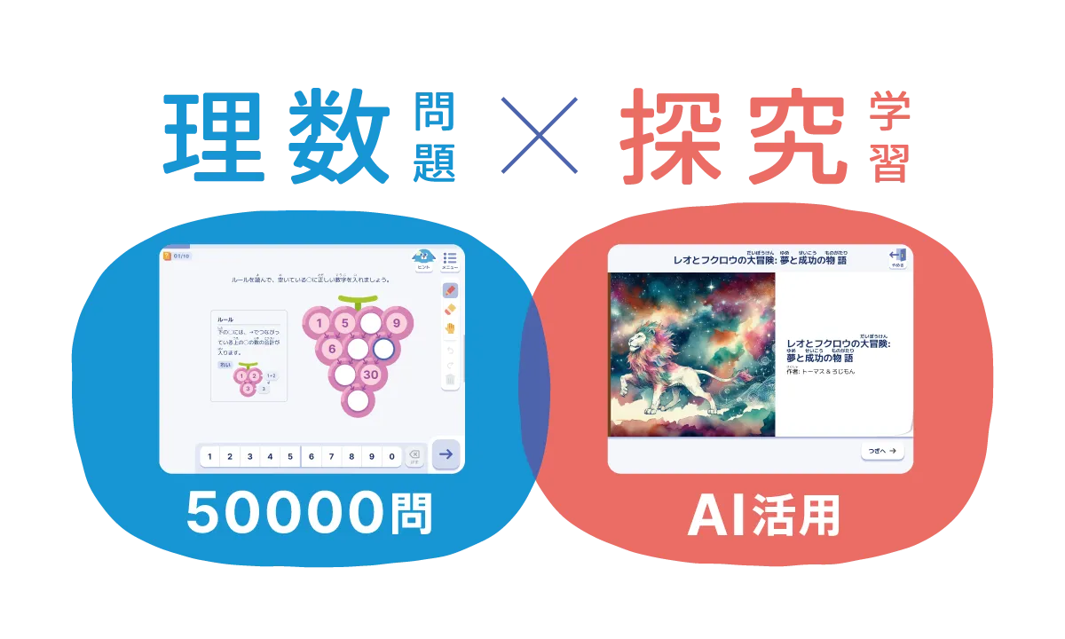 計算や読解などの基礎的な力だけでなく、論理的思考力を鍛える理数問題や、正解のない探究学習を通じて、自ら考え表現する力を育みます。「理数教材」と「探究教材」の両輪で、生徒の「考える力」を育むコースです。